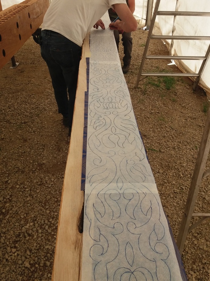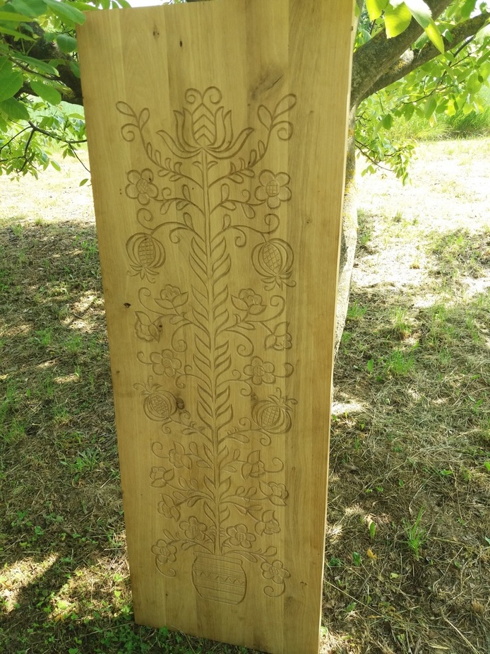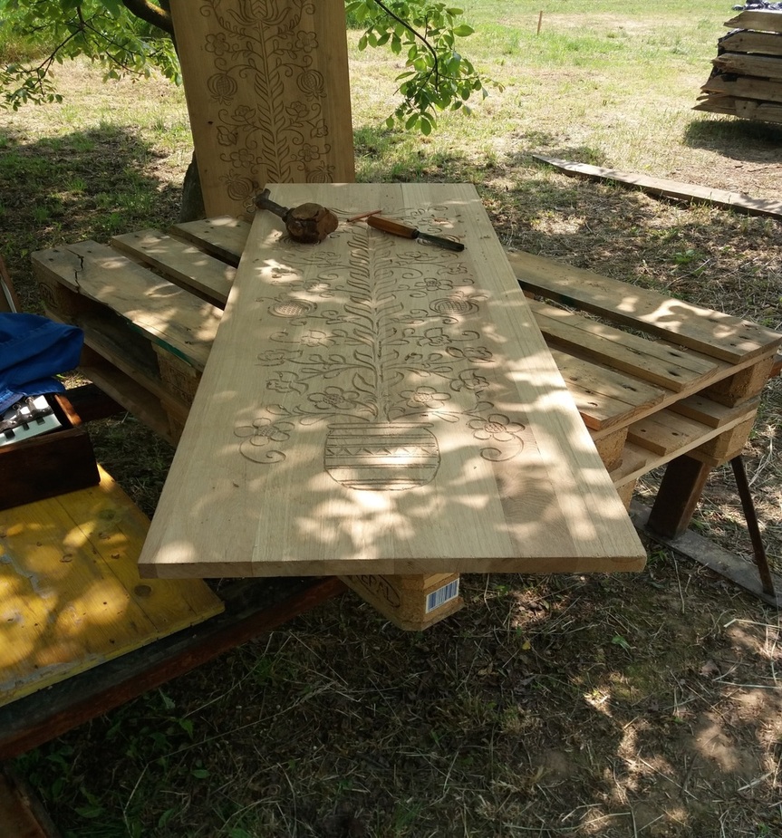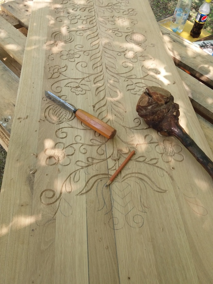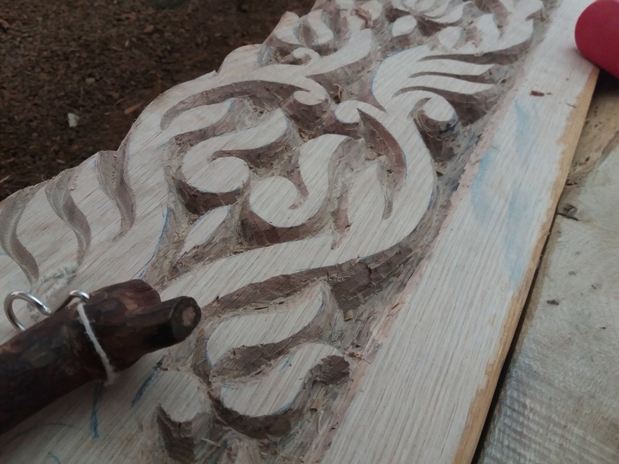 Itt még látható a papírcsík, amiről a motívumot rajzoltuk fel a felületre. Ez már a „háromszéki módon” faragott minta