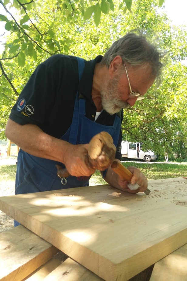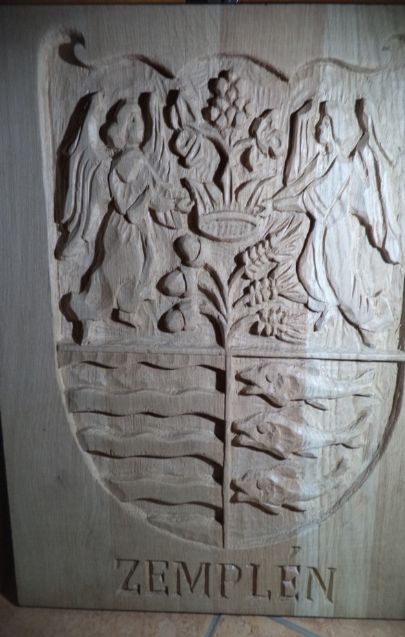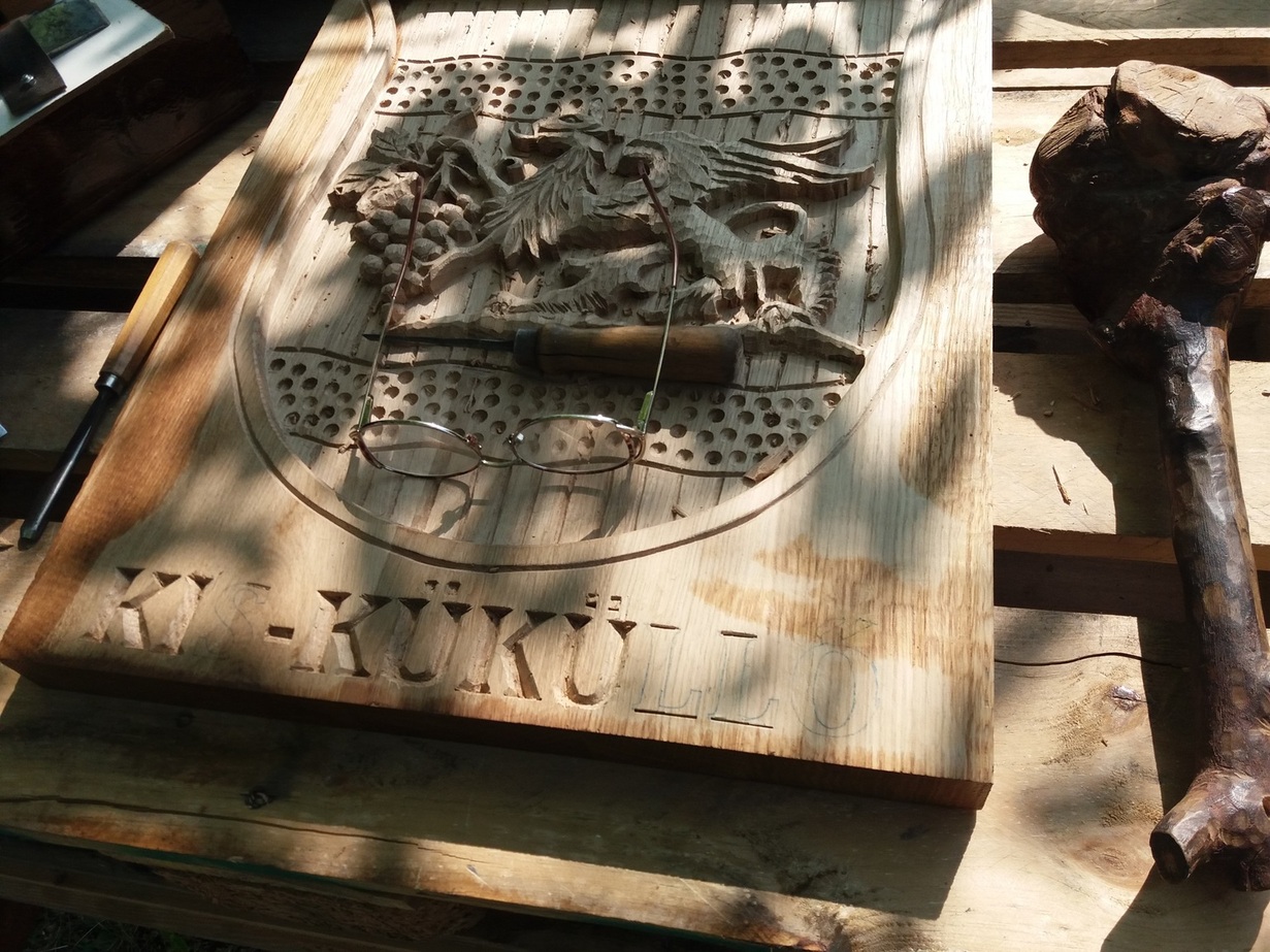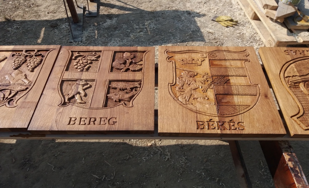 Volt olyan kolléga, aki elfelejtette felfaragni a vármegye nevét…, a helyszínen nekem kellett pótolni. (ez címer amúgy marófejjel lett csinálva…)